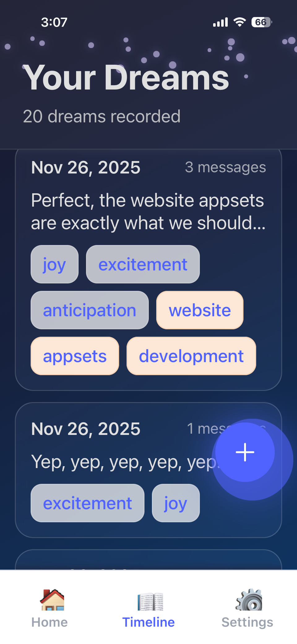 Open the app in the morning and tap record. Speak your dream naturally—no typing needed.