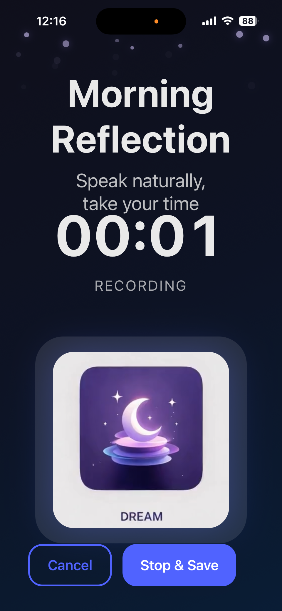 Open the app in the morning and tap record. Speak your dream naturally—no typing needed.